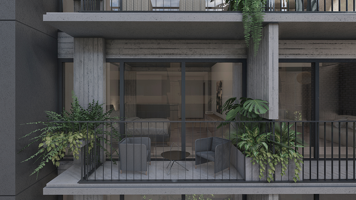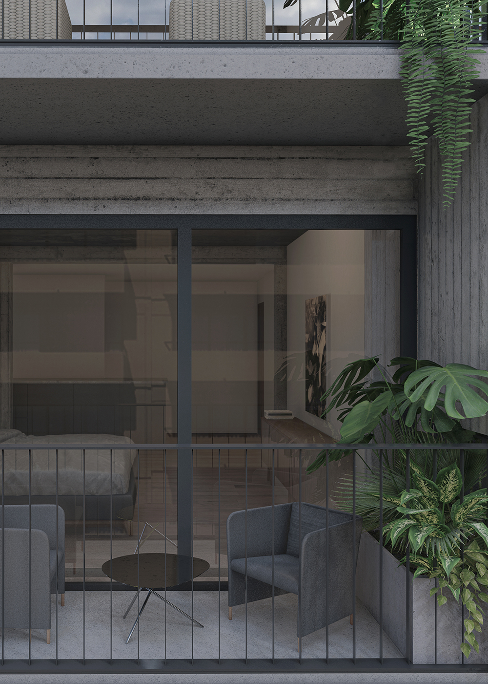 La conexión espacial con el exterior es lograda a través de balcones y semicubiertos que integran el interior de los departamento con el espacio urbano.